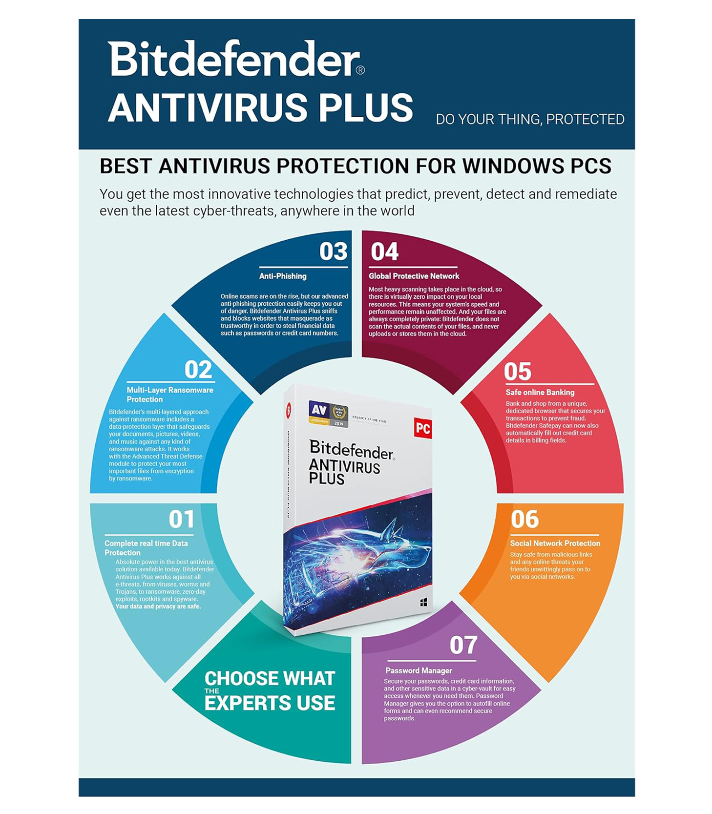 Bitdefender Antivirus Plus works against all e-threats β from viruses, worms and Trojans, to ransomware, zero-day exploits, rootkits and spyware. Your data and privacy are safe. Bitdefender Antivirus Plus uses a technique called behavioral detection to closely monitor active apps. The moment it detects anything suspicious, it takes instant action to prevent infections.